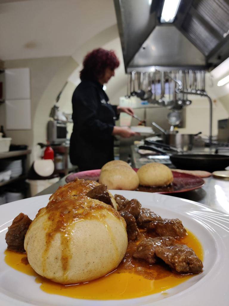 Il ristorante, oltre ai vari piatti del menù, propone su ordinazione polenta di patate con selvaggina o coniglio e i deliziosi "Gnocchi Boemi": gnocchi di pane con un cuore di prugna cotti al vapore e serviti con spezzatino di vitello, o con burro fuso, zucchero e cannella, e marmellata di prugne fatta in casa.